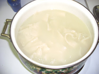5) Dust with more flour and add to 2 quarts of boiling broth (without the chicken – you’ll put the chicken or turkey in for a few minutes after the dumplings are done to heat) one dumpling at a time.
